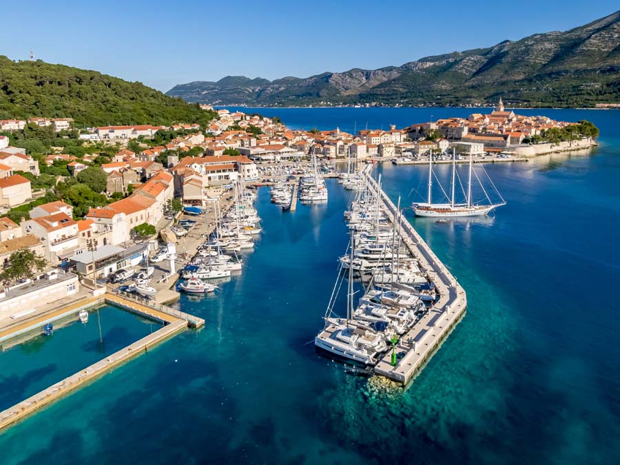 ACI Marina Korčula is set directly beside the historic old town of Korčula, offering one of the most atmospheric berthing locations in southern Dalmatia. The marina lies along the eastern edge of the peninsula, with immediate views of fortified walls, stone towers, and red-roofed houses rising above the waterfront.